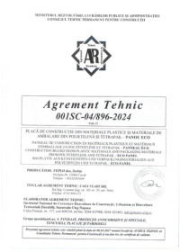 | 1 | Clasa de reatie la foc-valabilă pentru panoul ECO cu grosimea de 10 mm și densitatea de 826 kg/mc | MSZ EN 13501-1+ A1 : 2010 | E* | |